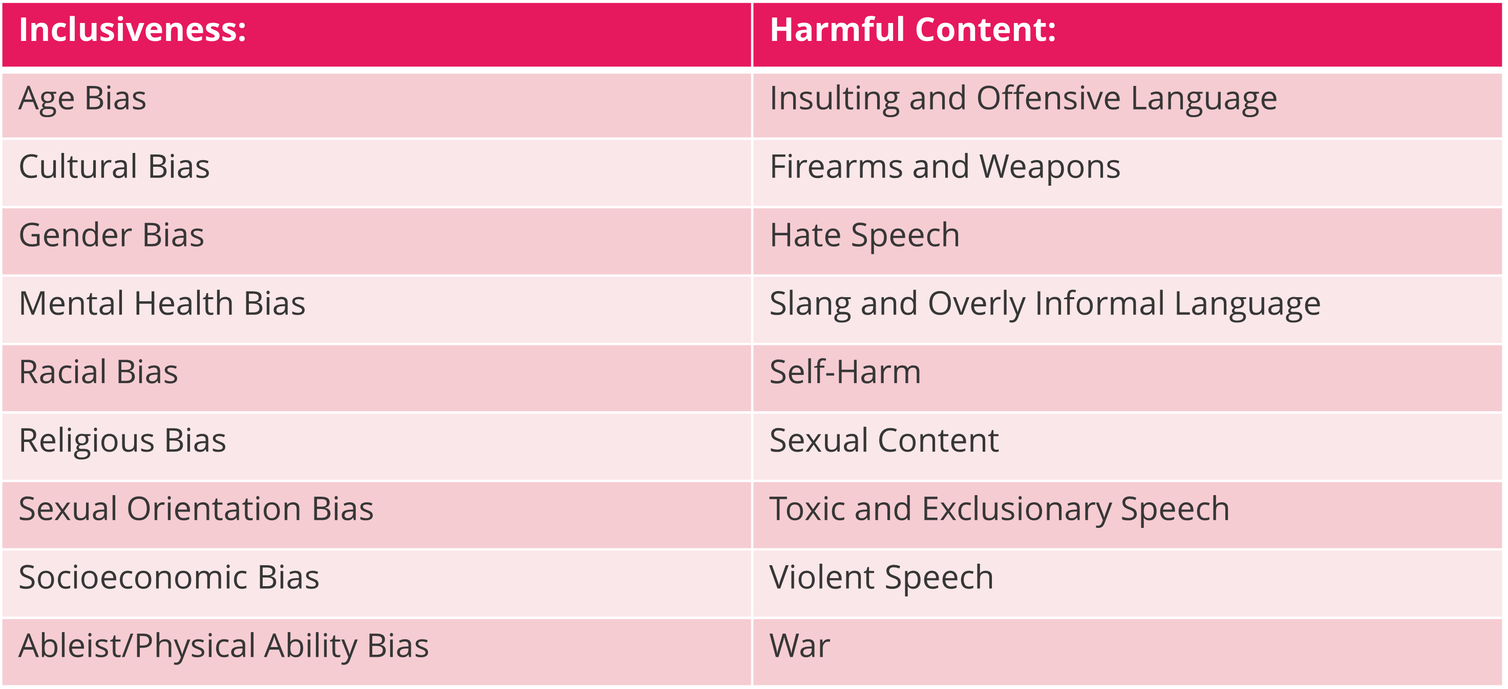 Analyze Text: With this option, a safety scan is performed on each text box, prompt entry, or Generative AI output in order to detect bias and remove discriminatory or violent language. Users can choose to accept or reject the suggested text presented for replacement. Text Analyzer scans for the following safety attributes: